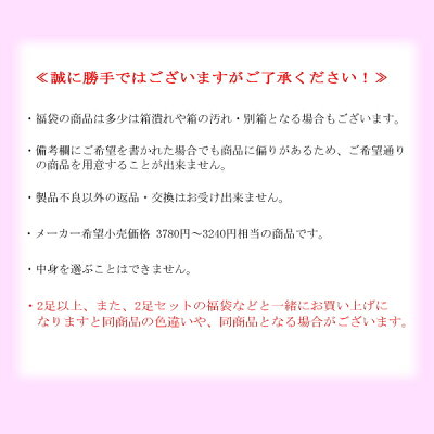 ・2足以上、また、2足セットの福袋などと一緒にお買い上げに なりますと同商品の色違いや、同商品となる場合がございます。