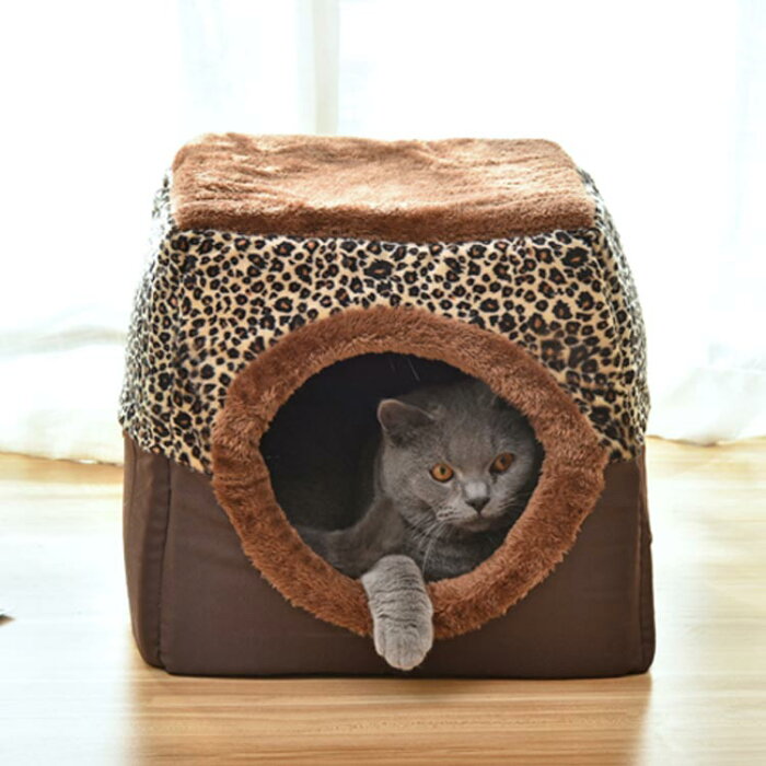 ハウス ペットベッド 猫用ベッド 2WAY クッション型 小型犬 猫 ドーム型 犬猫兼用 犬 ペット用品 ペットハウス 屋根付き 隠れ家 多用 ドームハウス ヒョウ柄 あったか