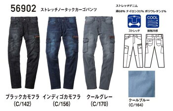 接触冷感ストレッチデニム Jawin 56902ノータックカーゴパンツ 全5色レディスサイズL59-L67 メンズサイズW70-112綿68%ナイロン31%ポリウレタン1% 7.3ozサマーデニム2020SS 自重堂 春夏物 新商品