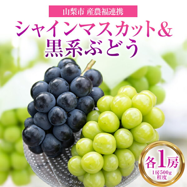 何が届くかお楽しみに! (※)出典:農林水産省 令和3年2月18日公表 ■お礼品の内容について ・シャインマスカット[500g程度×1房] 原産地:山梨県山梨市 賞味期限:出荷日+6日間 ・黒系ぶどう [500g程度×1房] 原産地:山梨県山梨市 賞味期限:出荷日+6日間 ■原材料・成分 山梨市産シャインマスカット 黒系ぶどう ■注意事項/その他 ※生鮮物ですので期限は目安となります。